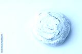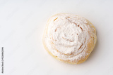 Freshly baked sweet roll topped with powdered sugar on a clean white background