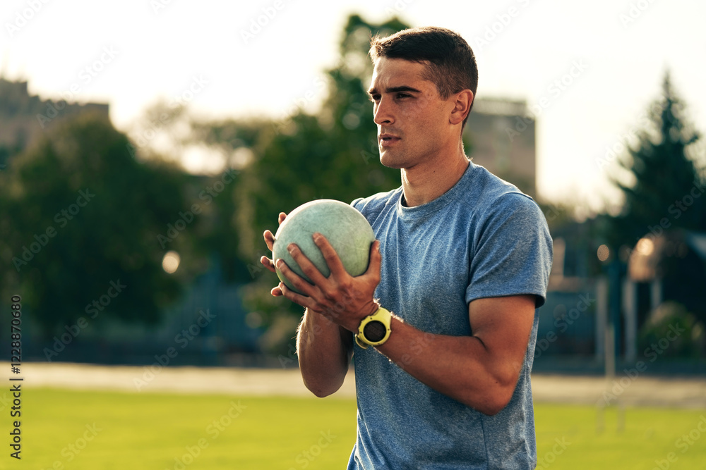 Athlete prepares for shot put competition at a sunny outdoor track and field facility