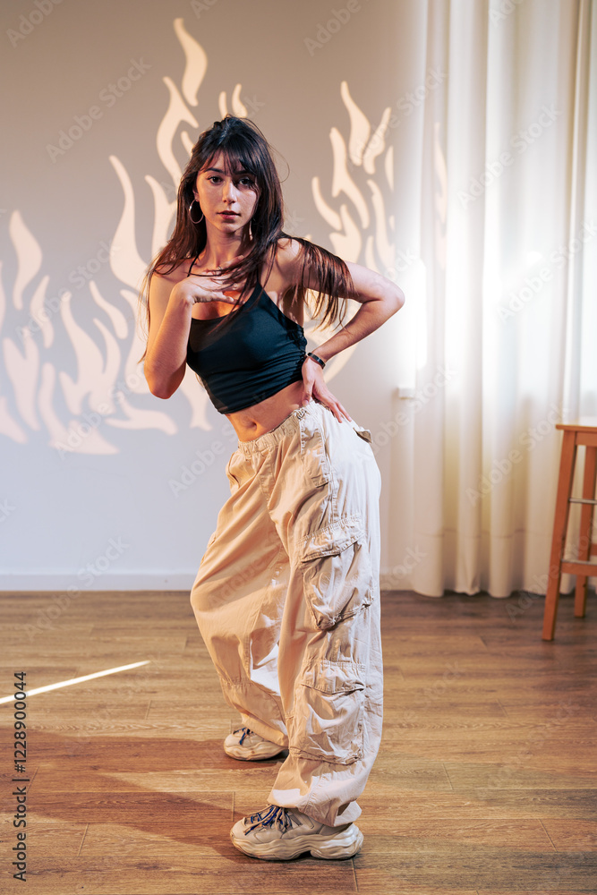 Dancer performs dynamic choreography in a modern studio with artistic lighting