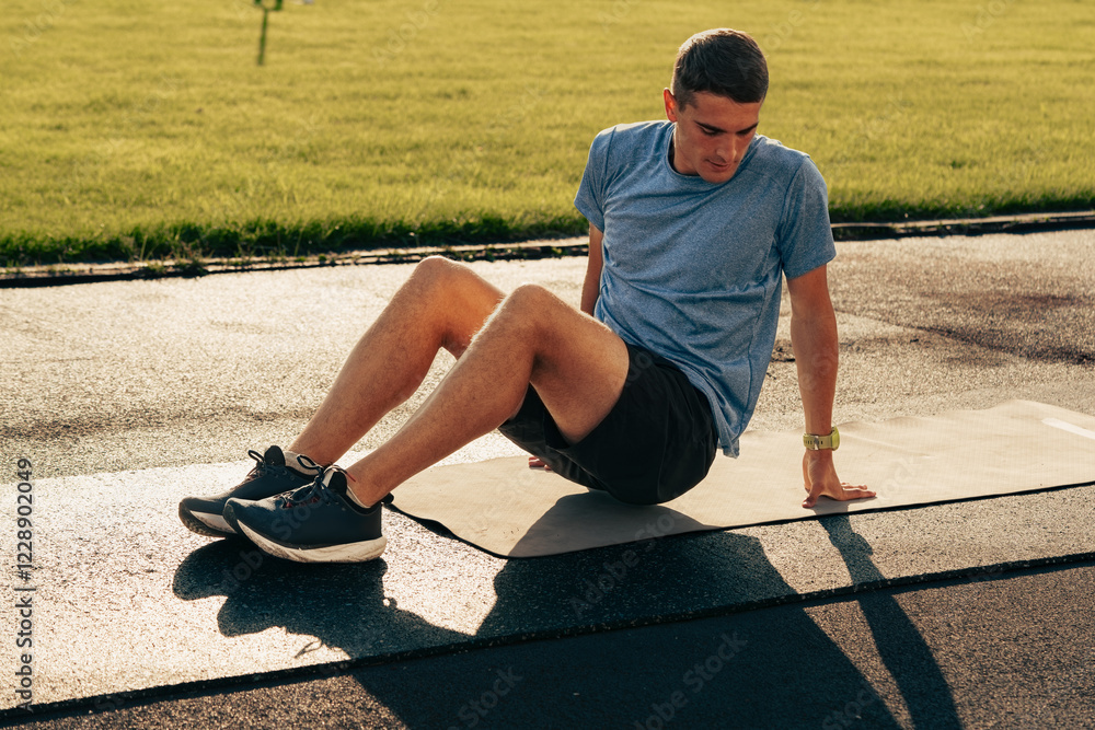 Young man performs bodyweight exercises on mat in park during sunny afternoon workout session