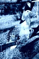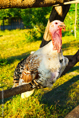 Turkey perched on a wooden branch in a green field under sunlight during the afternoon
