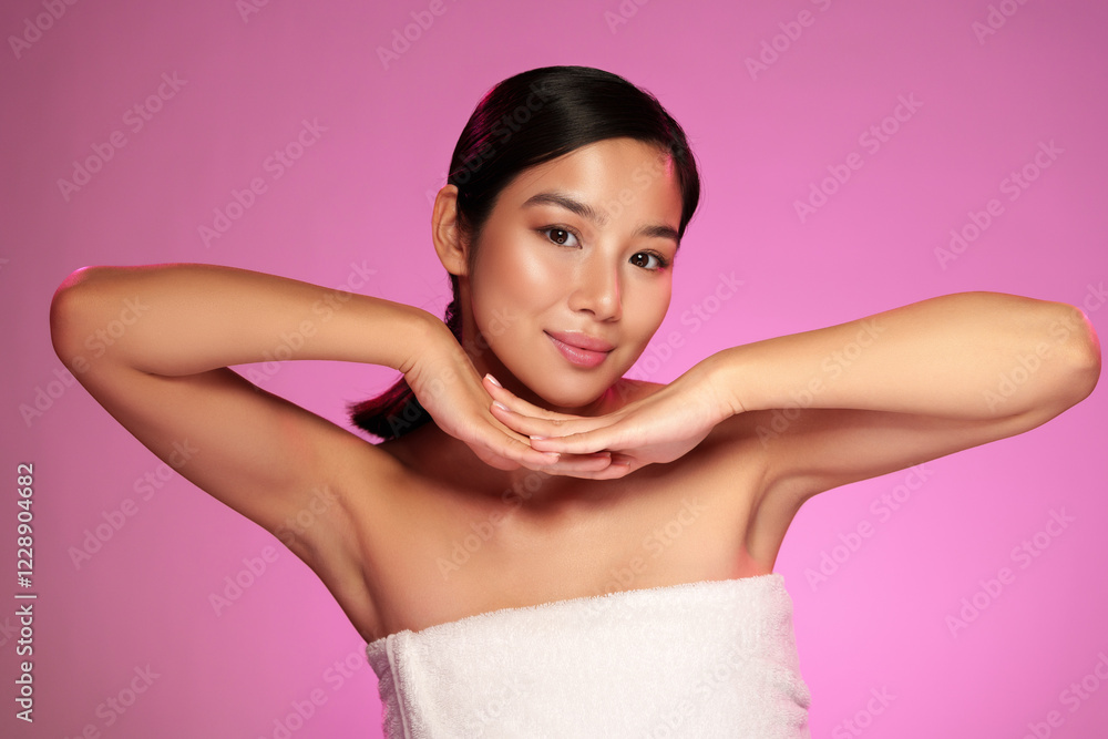 Young woman posing confidently with hands under chin against pink background during a studio photoshoot
