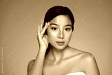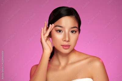 Model poses elegantly with a soft expression against a vibrant pink background in a beauty shoot