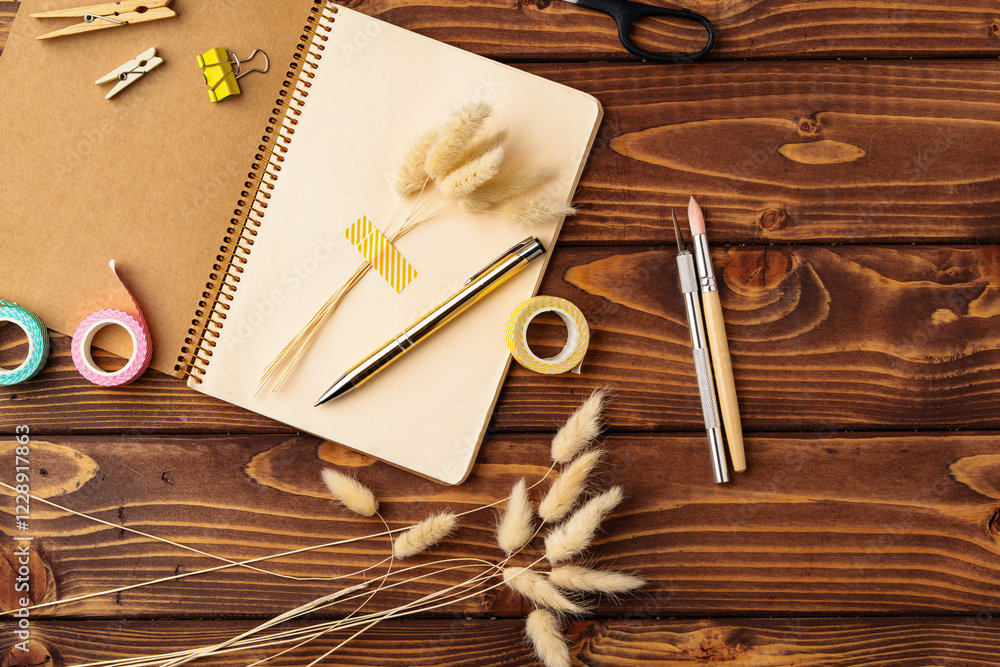 Creative workspace with stationery, decorative items, and natural elements on a wooden table