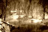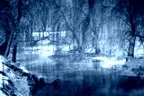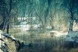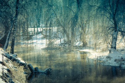 Beautiful winter landscape. View of the river and frozen trees.