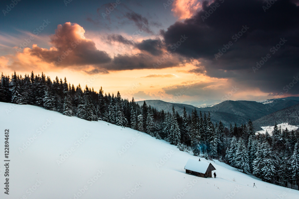 Colorful winter evening in the mountains at sunset. Dramatic overcast sky. View of the old farm and tourist near.
