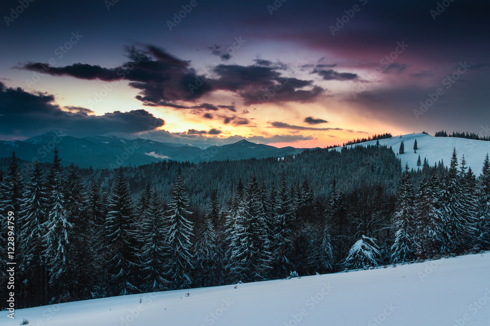 Colorful winter evening in the mountains at sunset. Dramatic overcast sky.