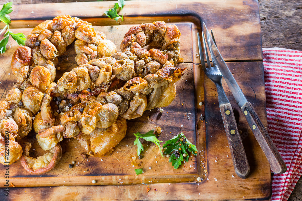 Roasted chunchules. Typical Latin American Chilean and argentine food.