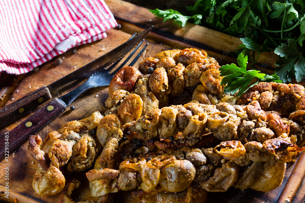 Roasted chunchules. Typical Latin American Chilean and argentina food.