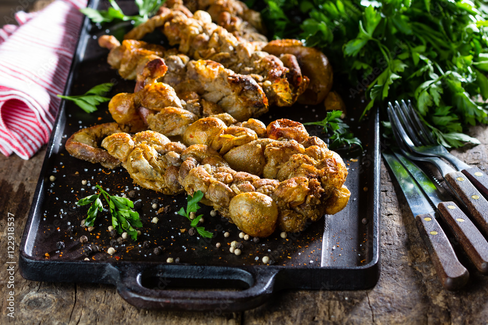 Roasted chunchules. Typical Latin American Chilean and argentina food.