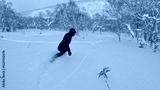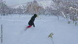 Active female tourist shreds deep powder snow in the backcountry of Rusutsu during a heavy snowstorm. Unrecognizable fit young woman in black and dark red gear snowboards off piste during a blizzard.