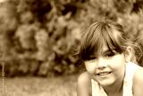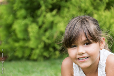 Closeup portrait of the smiling beautiful little girl lying on the grass and looking at the camera.