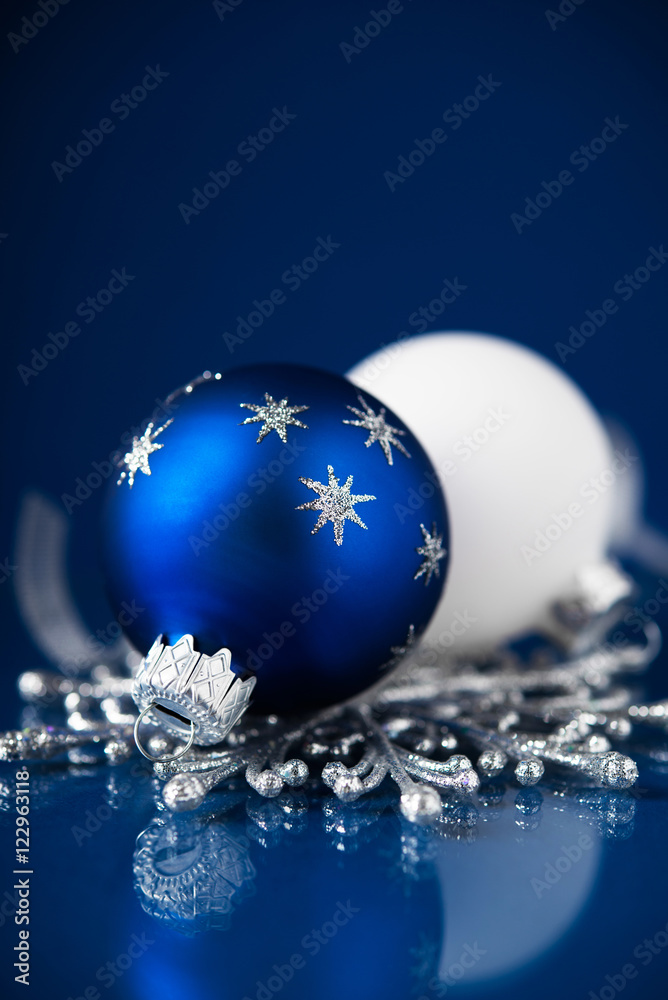 Silver and blue christmas ornaments on dark blue background. Merry christmas card. Happy holidays.