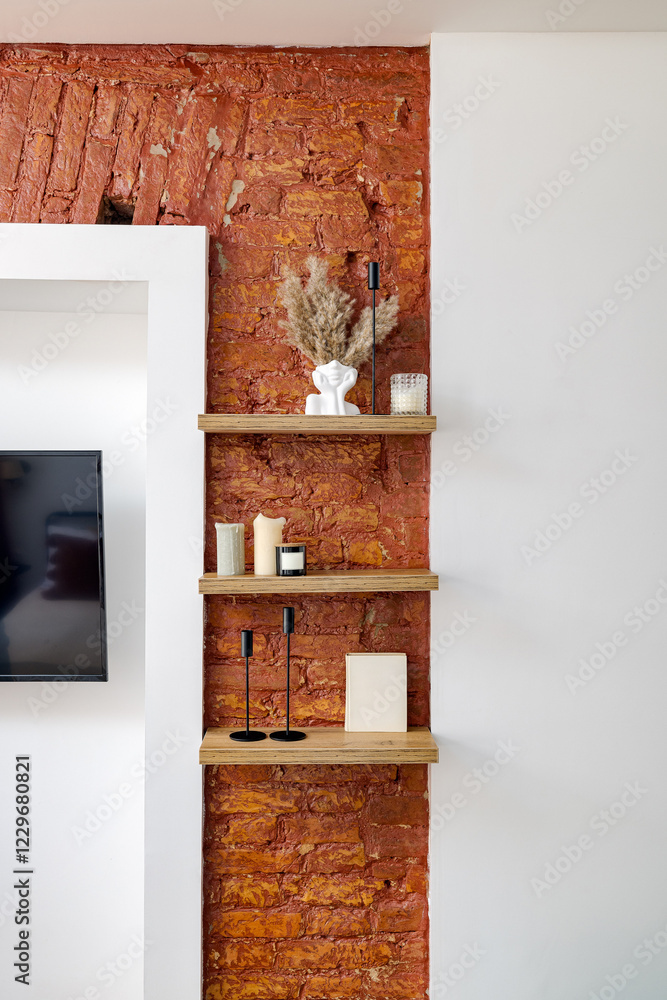 Stylish Living Room Shelf with Decorative Items and a Textured Wall for a unique ambiance