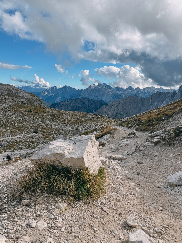 A rocky mountain range with a cloudy sky in the background. The sky is mostly blue with some clouds scattered throughout