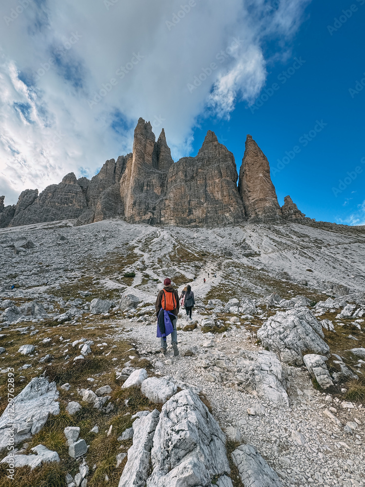 Two people are walking up a mountain with a blue sky in the background. The mountain is rocky and steep, and the two people are carrying backpacks