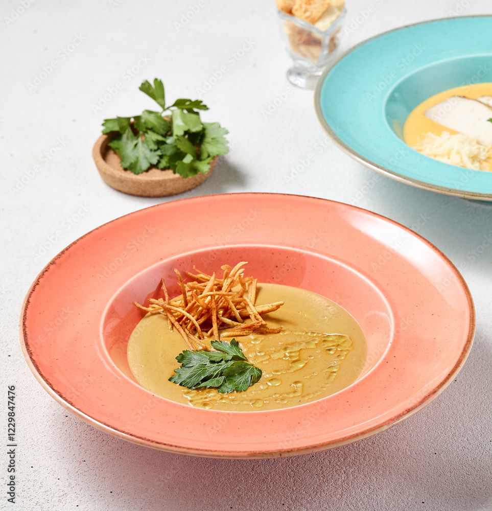 Gourmet Mushroom Cream Soup with Truffle Oil and Croutons in Vibrant Pastel Palette