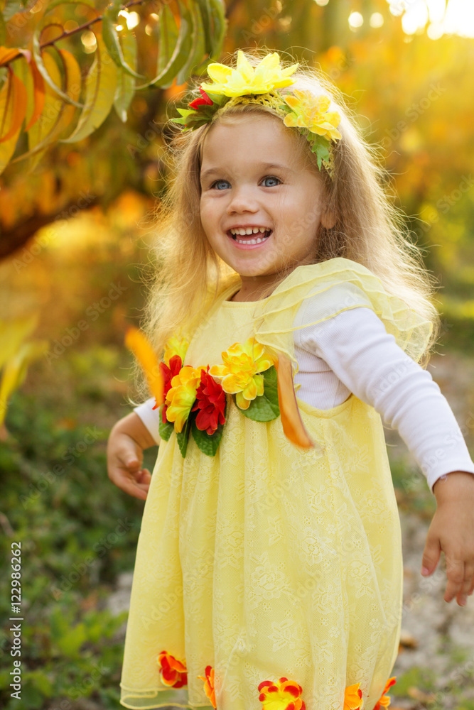 Little girl in autumn garden with yellow trees