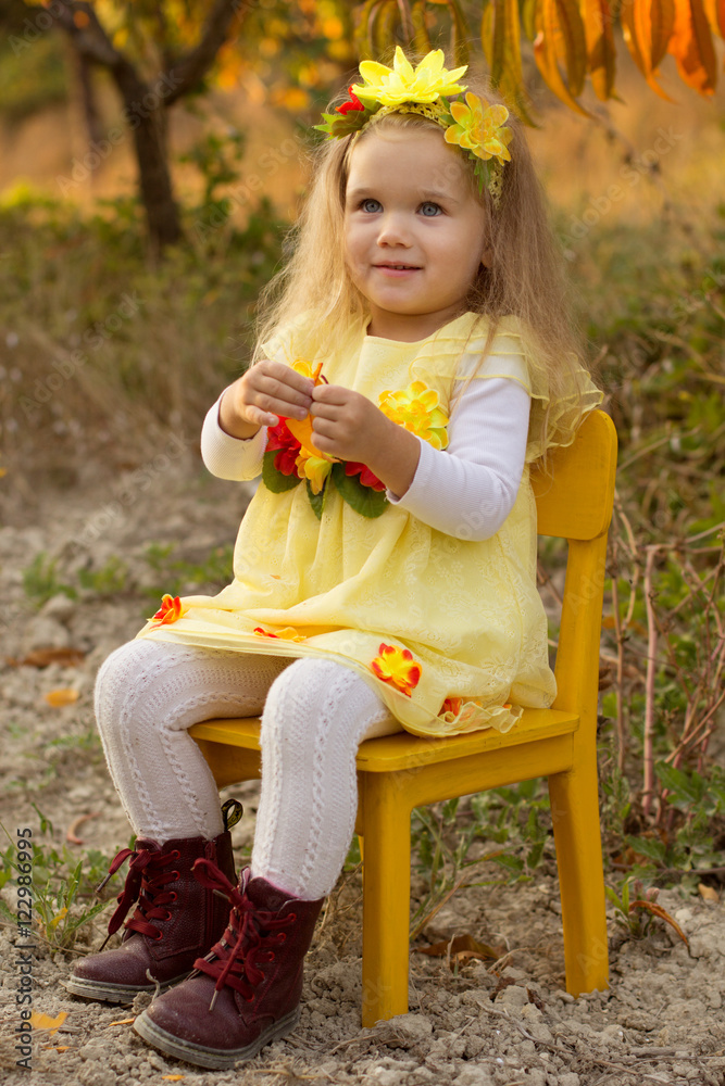 Little girl is sitting on yellow chair