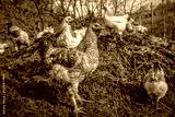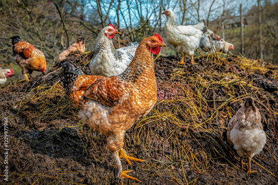 Chickens on the manure pile in the village