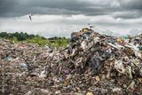 Gulls and other birds on the garbage dump under stormy sky