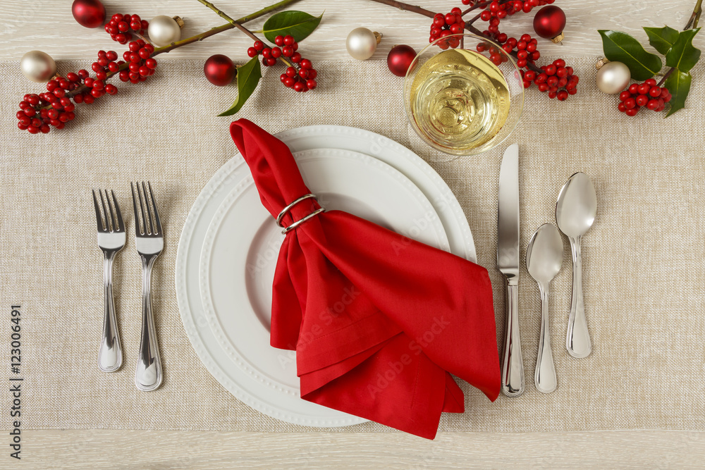 Christmas holiday place setting table setting fine dining home decorations with plates, white wine in wine glass and silverware