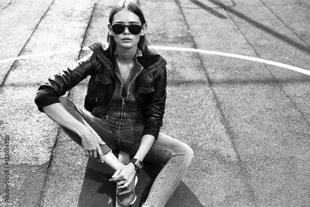 young stylish hipster woman outdoor, wearing sunglasses