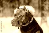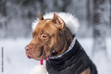 winter forest chocolate colored pitbull in red Santa Claus hat