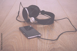 Headphones and phone on a wooden surface Vintage Retro Filter.