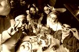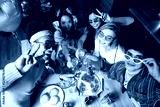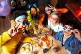 Group of friends making party at home on new year evening. Young women and men celebrating in the apartment drinking and eating, dancing and having fun. Concept about holidays and parties.