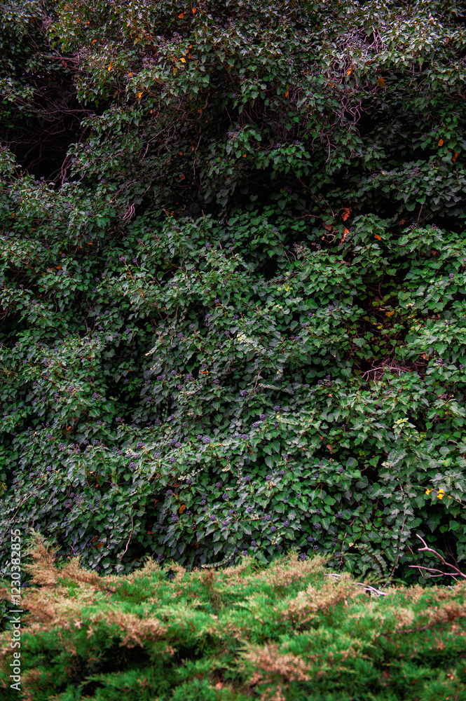 Dense green ivy foliage covering a wall with blooming yellow flowers in the foreground.
