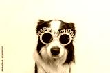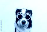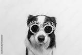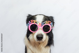 Happy Birthday party concept. Funny cute puppy dog border collie wearing birthday silly eyeglasses isolated on white background. Pet dog on Birthday day