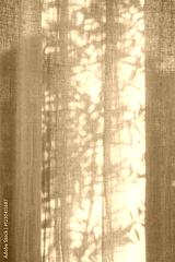 Floral sunlight shadows on a neutral beige linen curtains, aesthetic minimalist natural background with copy space