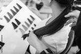 hands of stylist holding hair at barbershop
