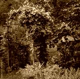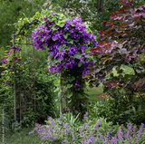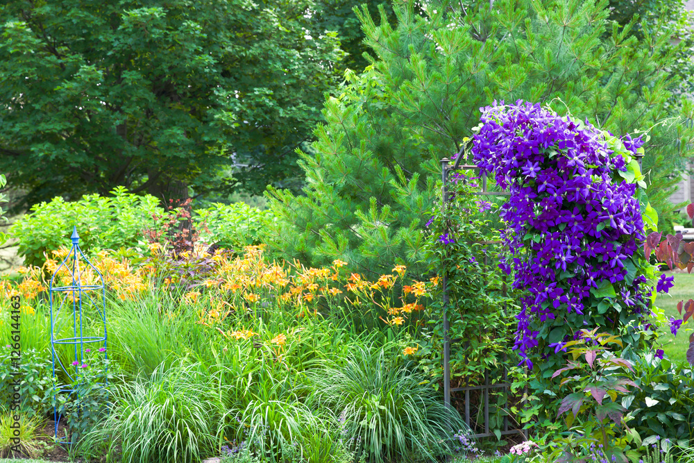 A spectacular purple clematis, jackmanii, in full bloom in July is the focal point of this impressionistic garden along with the common orange daylilies.