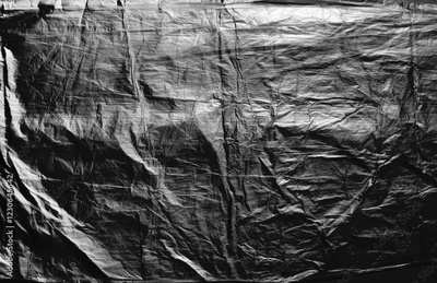 Empty crumpled foil cellophane paper blank texture copy space background. Black, white grunge scratch gray color.