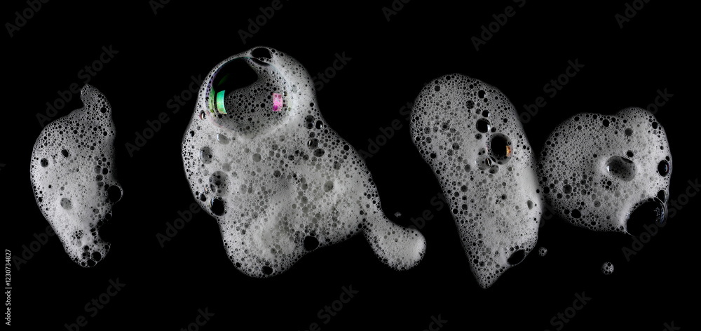 Soap foam isolated on black, with clipping path, texture and background, top view