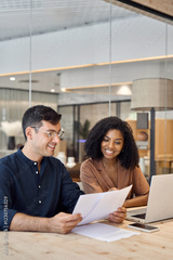 Diverse professional partners using laptop discussing document in office. Business team of two employees man and woman, manager and client talking on financial report working at work meeting. Vertical
