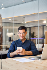 Smiling busy professional Hispanic business man sitting in office holding mobile cellphone. Young happy businessman entrepreneur using smartphone looking at cell phone technology at work. Vertical.