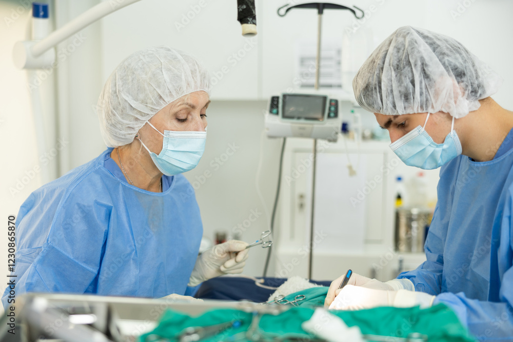 Senior woman experienced doctor of veterinary medicine is focused and attentively performs surgery on animal with male assistant. Man feed instruments, dressing material, monitors treatment process