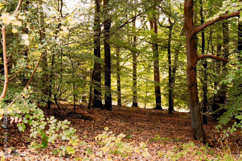 Sun shining through the trees in and english wood