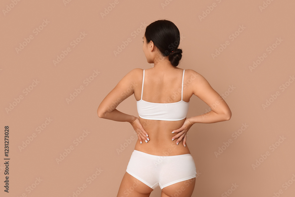 Slim young woman in underwear on beige background, back view. Weight loss concept