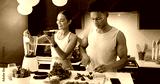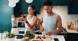 Happy, ingredients and couple with smoothie in kitchen for diet, health and wellness together. Love, smile and young woman and man with vegetables and fruit for nutrition juice breakfast in home.