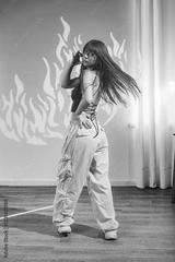 Young woman posing confidently in stylish outfit against a colorful wall with flame patterns