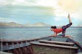 Caucasian woman practicing yoga at seashore