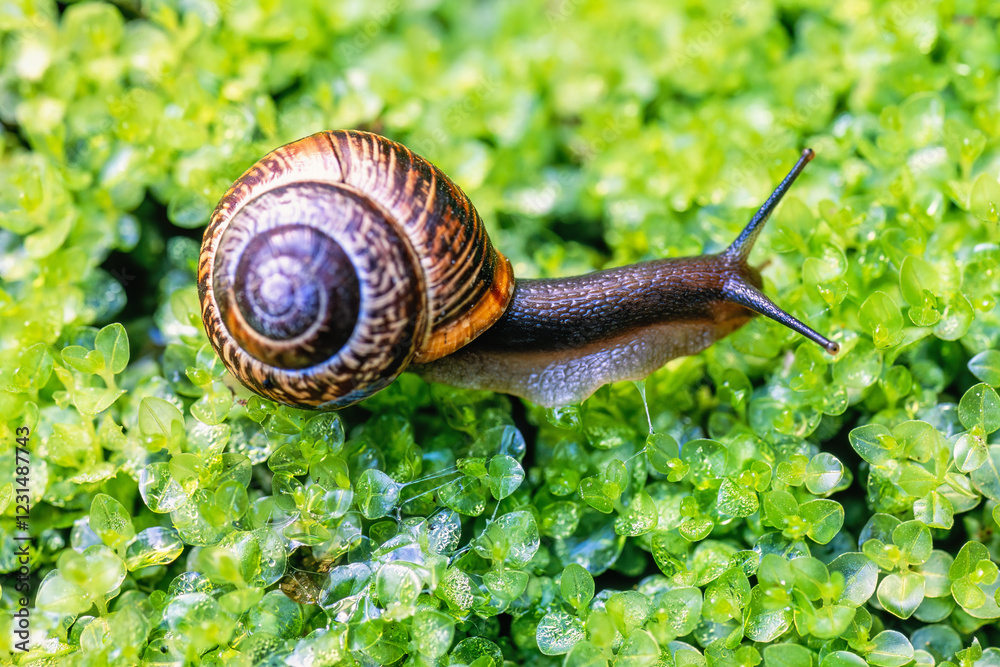 Snail crawling on moist green moss