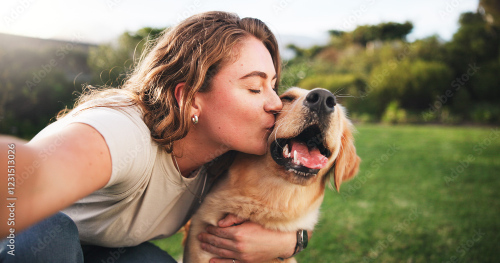 Woman, kiss and selfie with dog on grass field for picture, memory or companion in nature. Female person, labrador or golden retriever with hug or affection for capture, support or care for pet