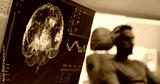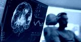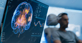 Medical Brain Scan on Computer Screen. Advanced Neuroimaging Technology Reveals Complex Neural Pathways. Patient Connected to Advanced Brain Scan in the Background