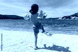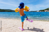 Back view cute little tanned boy kid in swimsuit sunscreen cap and fin funny walking dive in clear blue Mediterranean sea water on sunny summer day. Child have fun go snorkeling in flippers