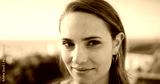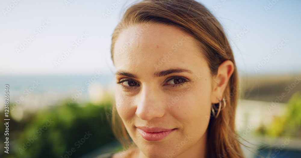 Outdoor, portrait and woman with smile, vacation and summer holiday with adventure. Happy person, ocean and traveller with weekend break, mindfulness or explore with positive energy and nature